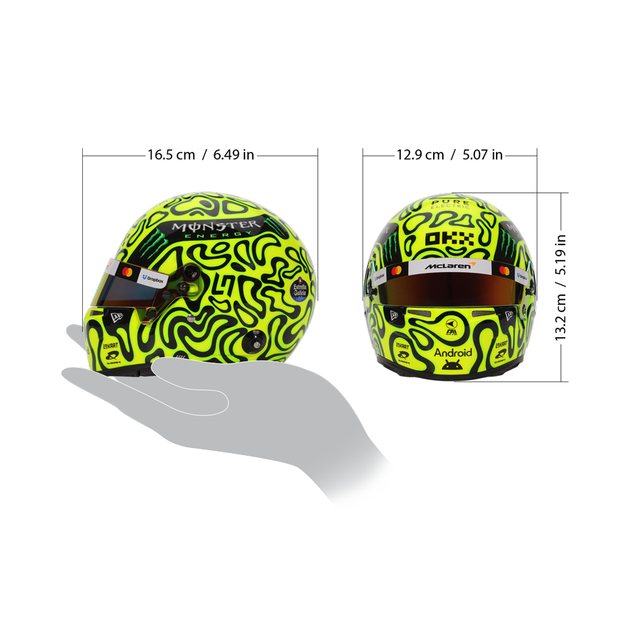 El MiniCasco Lando Norris 2025 es la réplica oficial Bell a escala 1:2 del casco que el piloto británico utilizará en la temporada 2025 de Fórmula 1. Fiel a su estilo inconfundible, Norris mantiene su icónico amarillo fluorescente, un color que lo hace destacar en la parrilla. Para 2025 regresan los famosos patrones de “manchas” (blobs), con formas fluidas que representan su conducción suave y precisa. El casco incluye detalles personales como su número 4 en la parte superior y su logotipo clásico en los laterales. Una pieza vibrante, moderna y llena de personalidad, ideal para coleccionistas y fans de McLaren.