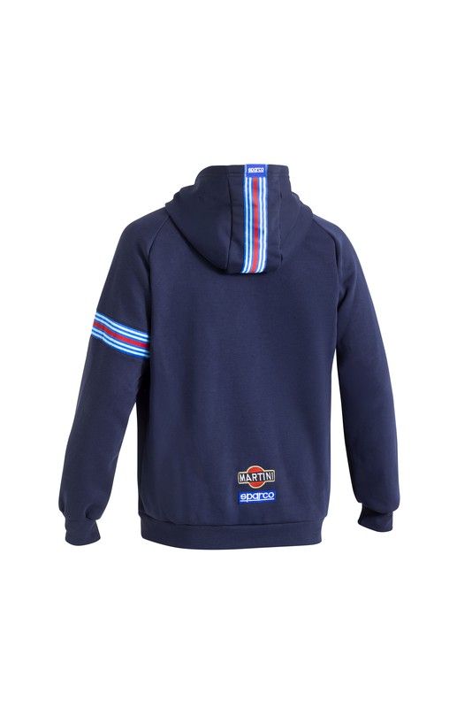 Sweat-shirt zippé Sparco Martini Racing, décliné en deux coloris : bleu marine et blanc. Il est orné de logos brodés et d'un style Martini Racing unique et exclusif.