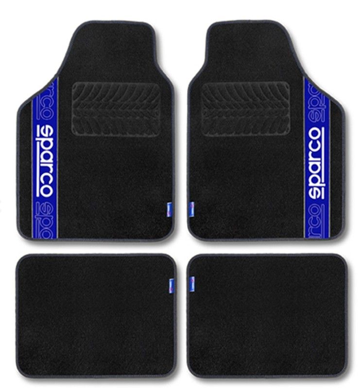 Jeu complet de 4 tapis de sol Sparco noirs avec logos bleus. Leur design sportif est universel pour tous les véhicules.