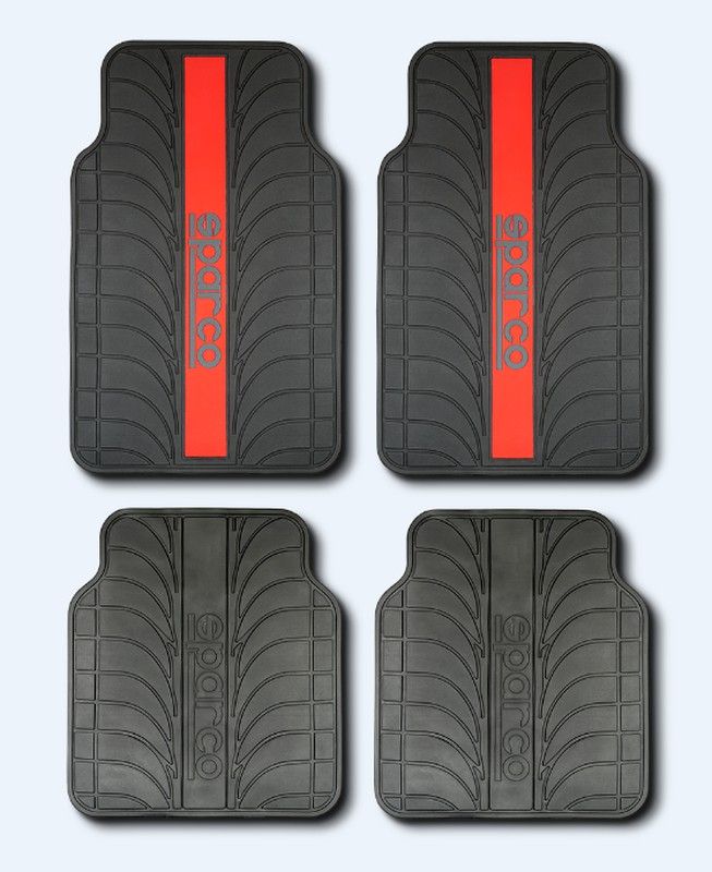 Les tapis de voiture Sparco sont faciles à nettoyer et antidérapants en PVC. Ils sont noirs avec des rayures rouges.