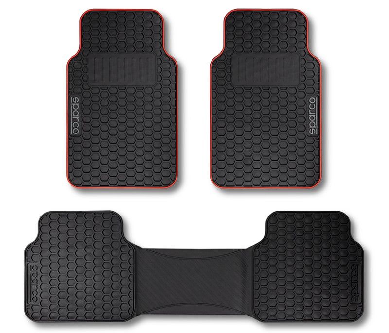 Les tapis de voiture Sparco sont faciles à nettoyer et antidérapants en PVC. Ils sont noirs avec des rayures rouges.