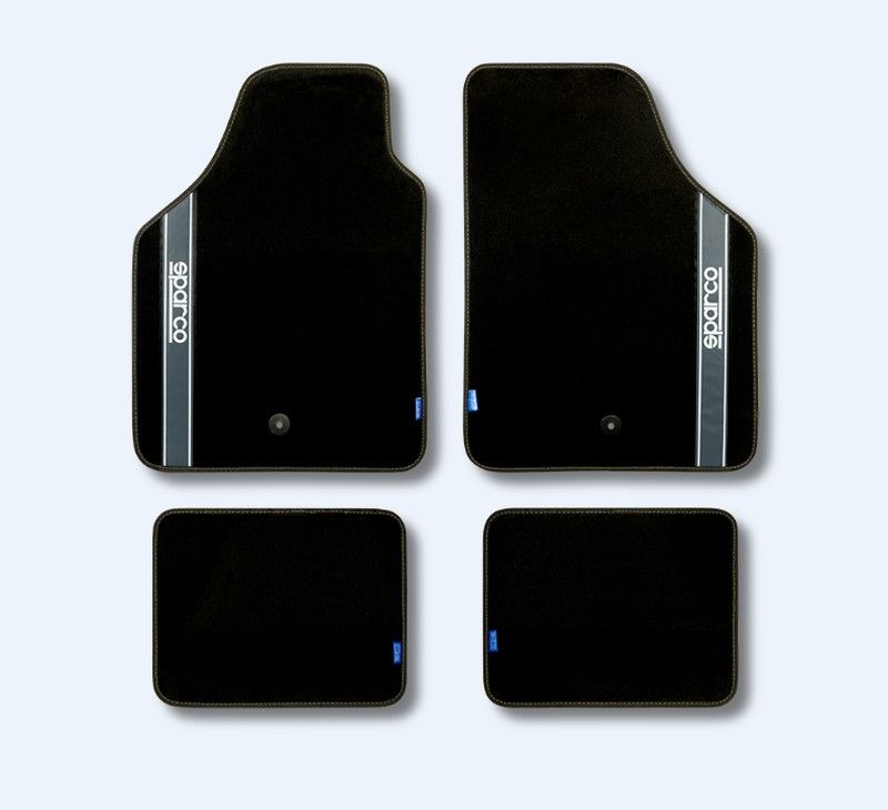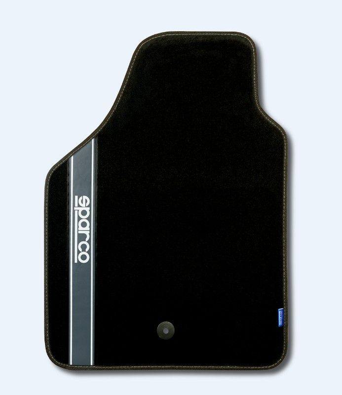 Tapis de voiture Sparco en moquette noire avec bande argentée Sparco. Faciles à nettoyer et pratiques.